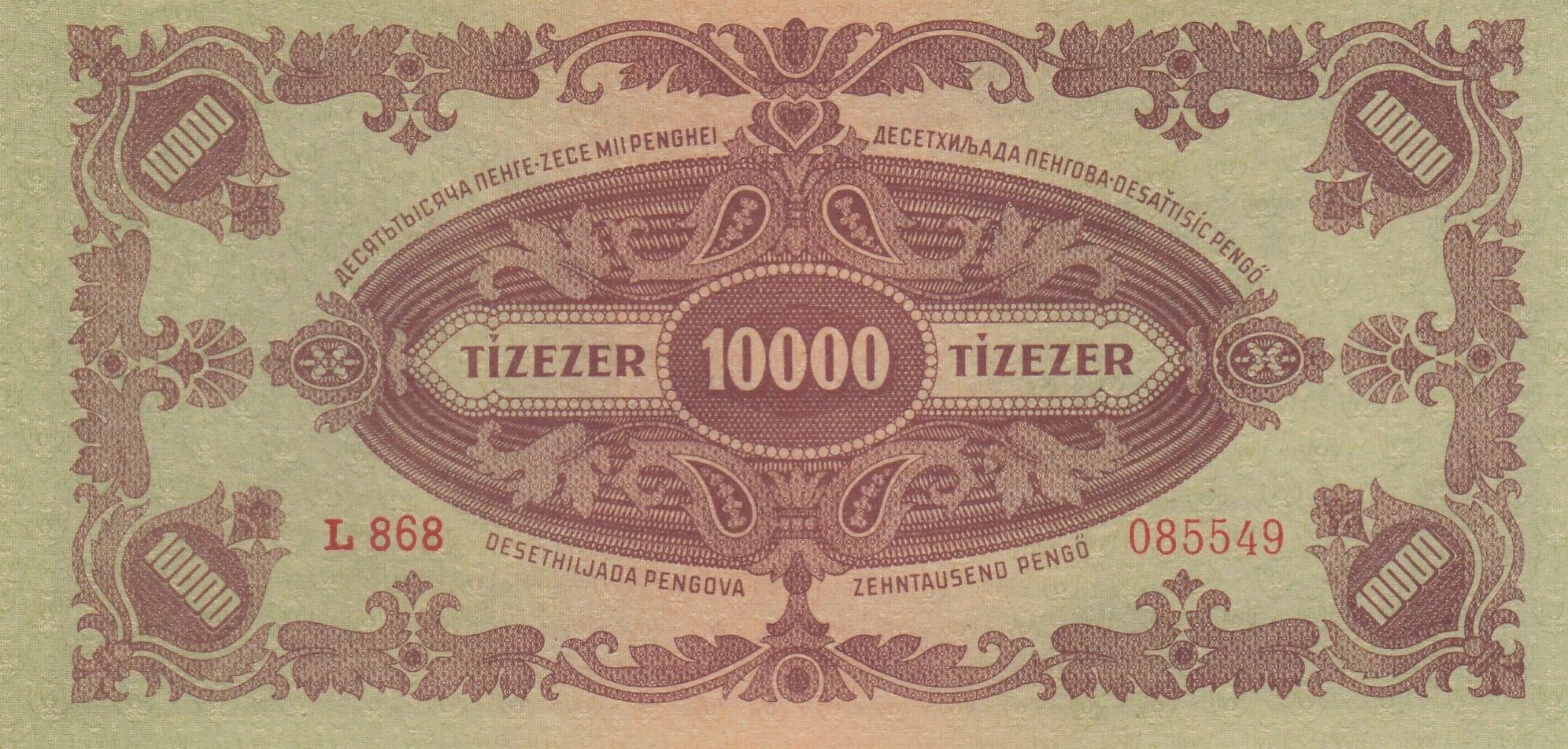 Voici une fiche numismatique descriptive du billet de 10000 peng? hongrois émis en 1945 :