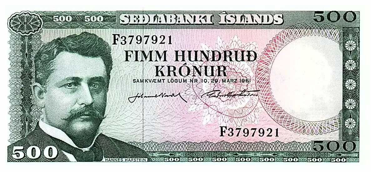 Banknote Iceland 500 kronur - Hannes Hafstein - 1961 - Serial F