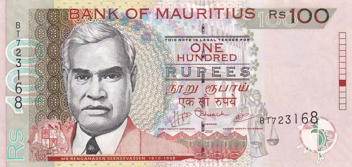 Ce billet mauricien de 100 roupies, imprimé par De La Rue et mesurant 145 × 70 mm, présente au recto le portrait de Renganaden Seeneevassen (1910-1958), figure politique et avocat mauricien, accompagné des inscriptions « BANK OF MAURITIUS RS 100 », « THIS NOTE IS LEGAL TENDER FOR ONE HUNDRED RUPEES » et son nom. Le verso illustre le Palais de la Cour suprême à Port-Louis, symbole de la justice et de l?histoire institutionnelle du pays, avec la même mention de valeur faciale. Élégant et représentatif du patrimoine national, ce billet souligne à la fois l?héritage culturel mauricien et l?importance des institutions