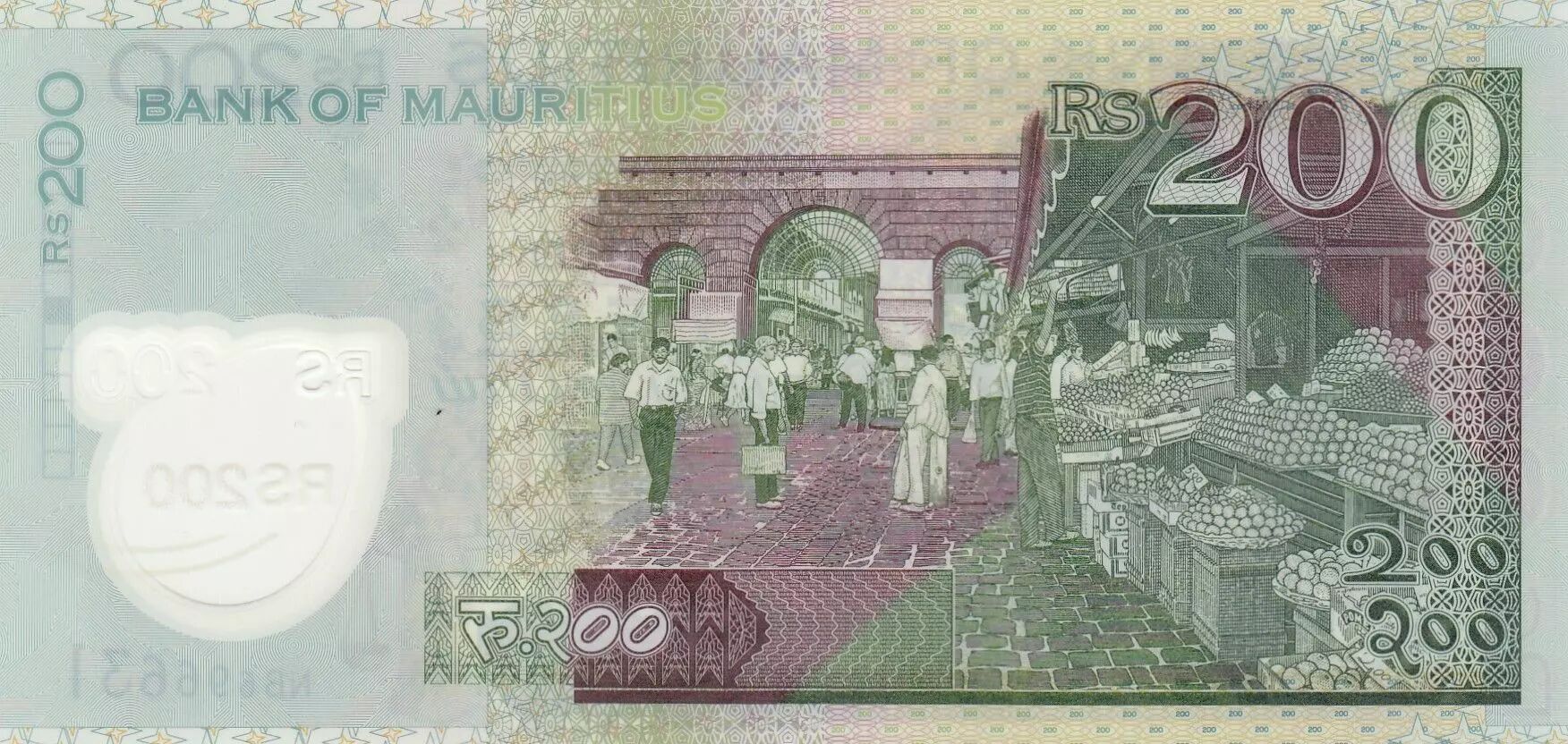Le verso du billet reprend les inscriptions en anglais, en hindi et en tamoul. Une autre représentation de la tête de dodo y est incluse. La scène principale représente des étals de produits diversifiés au marché central de Port Louis, illustrant l'activité économique et commerciale de la capitale mauricienne.