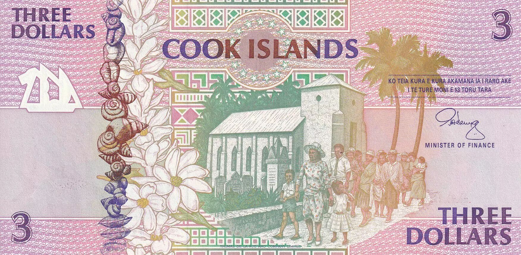 Billet Iles Cook 3 Dollars - Pélerins, église - Danseurs et poissons - 1992 - P.NEUF - P.7