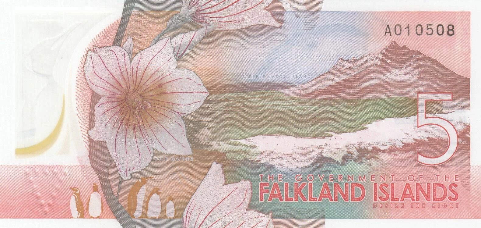 Le verso du billet présente une palette de couleurs rouge et multicolore. En bas à gauche, cinq espèces de pingouins sont illustrées. La fleur nationale, la vierge pâle, est placée au centre. Une représentation de la montagne de l'île Steeple Jason se trouve sur la droite.