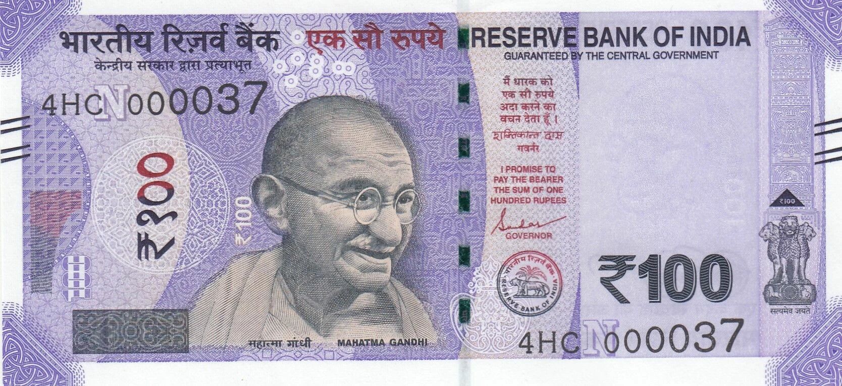 Ce billet de banque de 100 roupies, émis en Inde en 2024, fait partie de la série 4HC. Le recto du billet présente une impression en noir et rouge foncé sur un fond multicolore dans les tons violet et orange. L'effigie de Mahatma Gandhi est positionnée au centre du billet. Les dénominations sont indiquées en hindi et en chiffres occidentaux. Le sceau de la Reserve Bank est situé près de la base de l'image de Gandhi, tandis qu'une représentation de la statue aux trois lions se trouve près du coin inférieur droit.