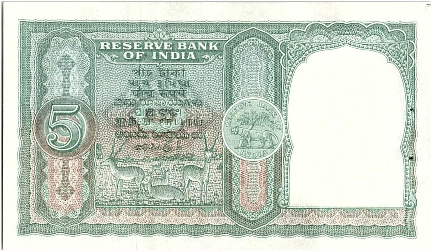 Billet Inde 5 Rupees, Colonne aux Lions - Antilopes - 19(49-57) - P.34 Rare