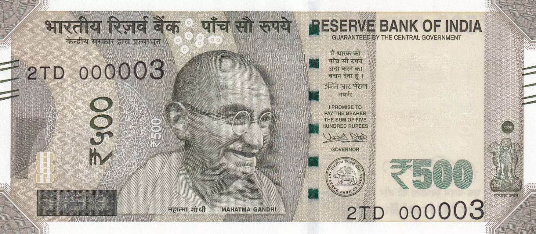 Billet Inde 500 Rupees, Mahatma Gandhi - 2017 Série 2TD - Petit numéro 000003