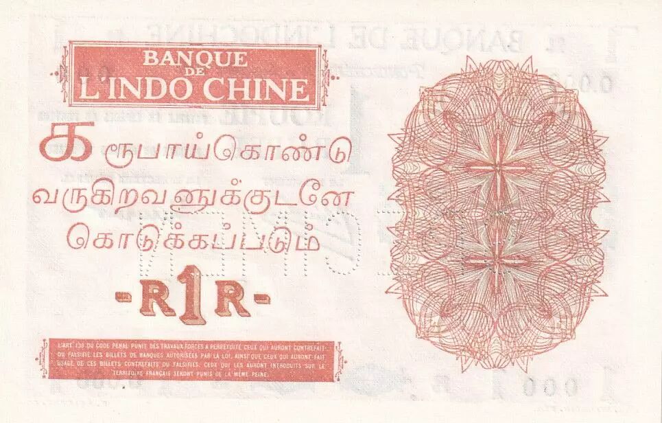 Les dimensions du billet sont de 120 mm de longueur et 80 mm de largeur. Ce format rectangulaire est typique des billets de cette époque. Le billet de 1 roupie des Indes Françaises est un témoignage de l'histoire monétaire et coloniale de la région, reflétant l'influence de la Banque de l'Indochine dans le système financier local.