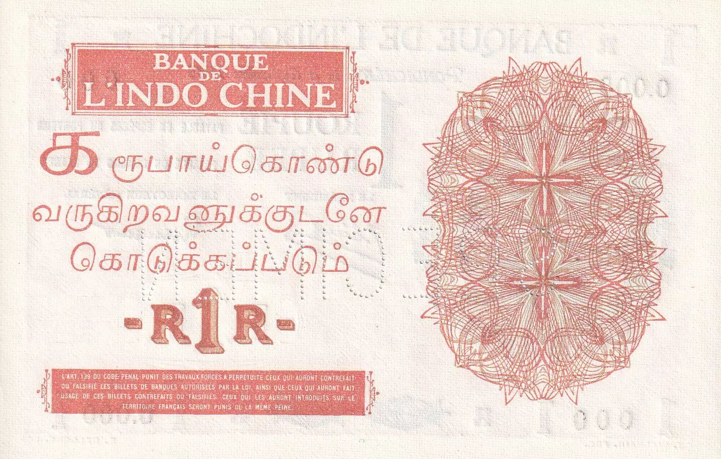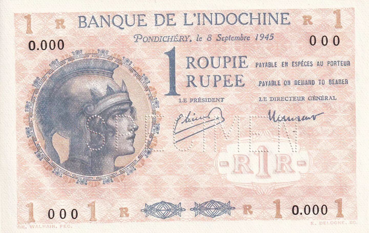 Billet Indes Françaises 1 Roupie - Femme casquée - Spécimen - 1945 - UNC - Kol.308ds