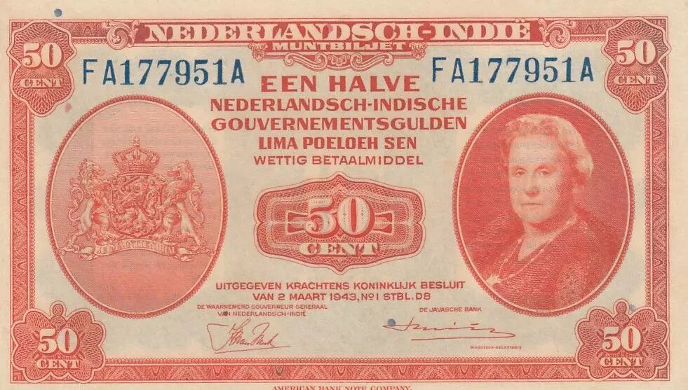 Billet Indes Néerlandaises 50 cent inde néerlandaise - 1943 - Reine Wilhelmina - Série FA