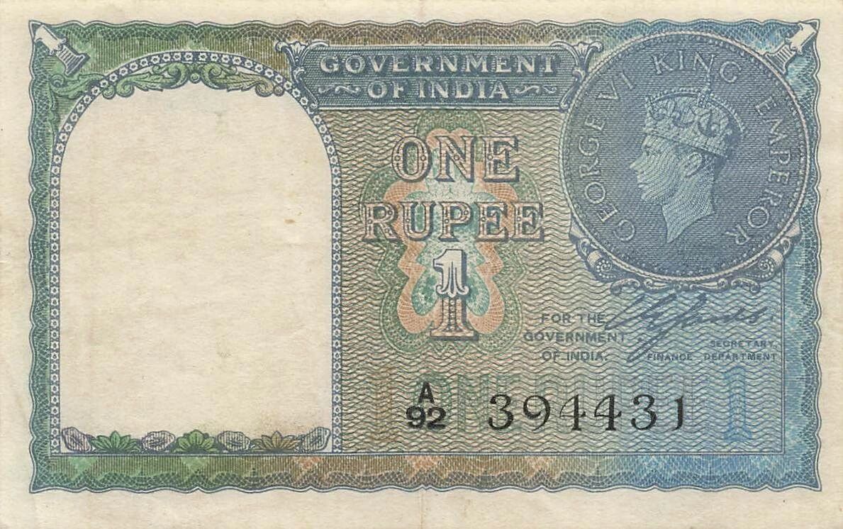 Home > World Banknotes > Asian Banknotes > India > India 1 Rupee - George VI - ND (1944) - P.25a