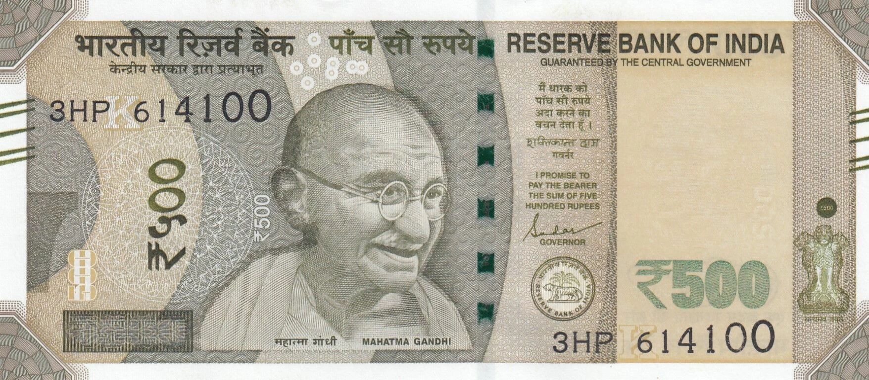 The 500 Rupee banknote, issued in India in 2024, features a distinctive design on both sides. This banknote is part of the 3HP series.