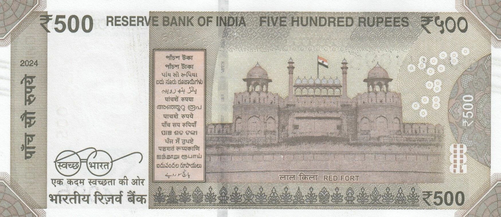 The reverse of the banknote is printed in black on a multicolored gray and white background. The Red Fort of Delhi, surmounted by the Indian flag in color, is depicted, symbolizing an important historical and cultural element of India. The year of issue, 2024, is inscribed in the upper left of the banknote. A representation of Gandhi's glasses is placed under the watermark area.