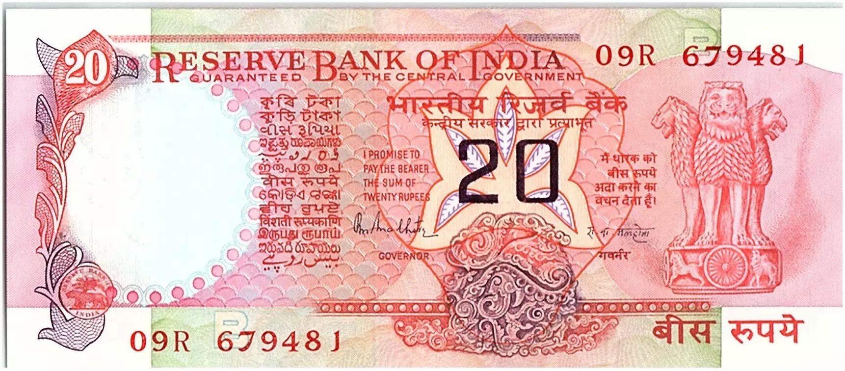 Banknote India 20 Rupees, Ashoka column - Wheel of time - 1985 - P.82 h