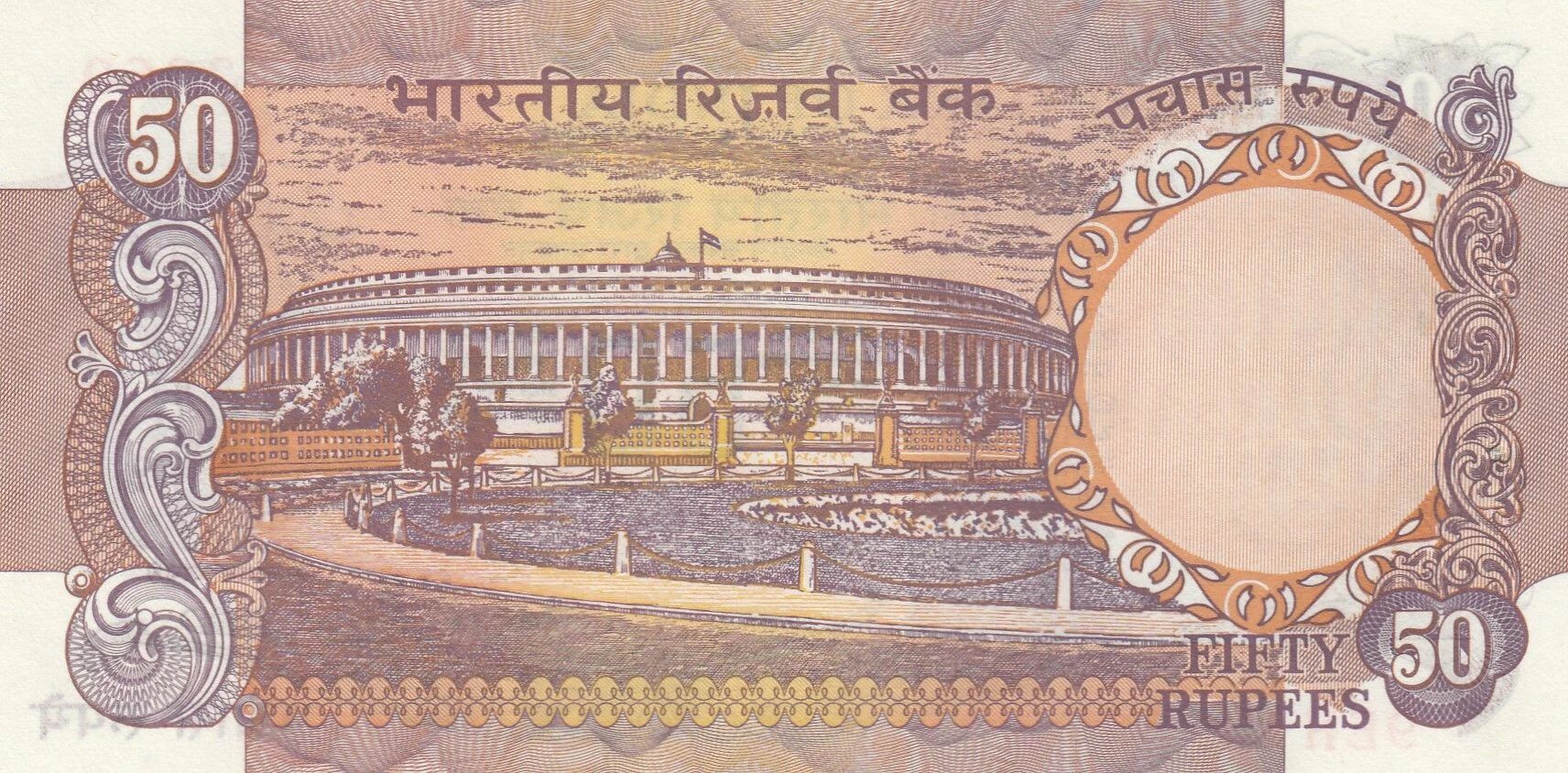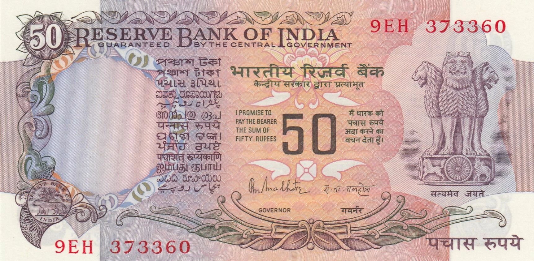 This banknote is issued by India and has a face value of 50 rupees. Its year of issue is 1978. It is referenced P.84 c.