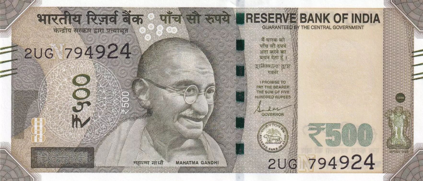 Home > > India 500 Rupees - Gandhi - 2023 - Serial 2UG- Letter N