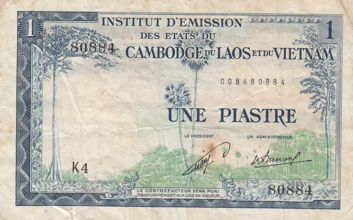 Billet Indo-Chine Fr. 1 Piastre - Arbres - M?T Ä?NG - Emissions pour le Laos - ND (1954) - Série K4
