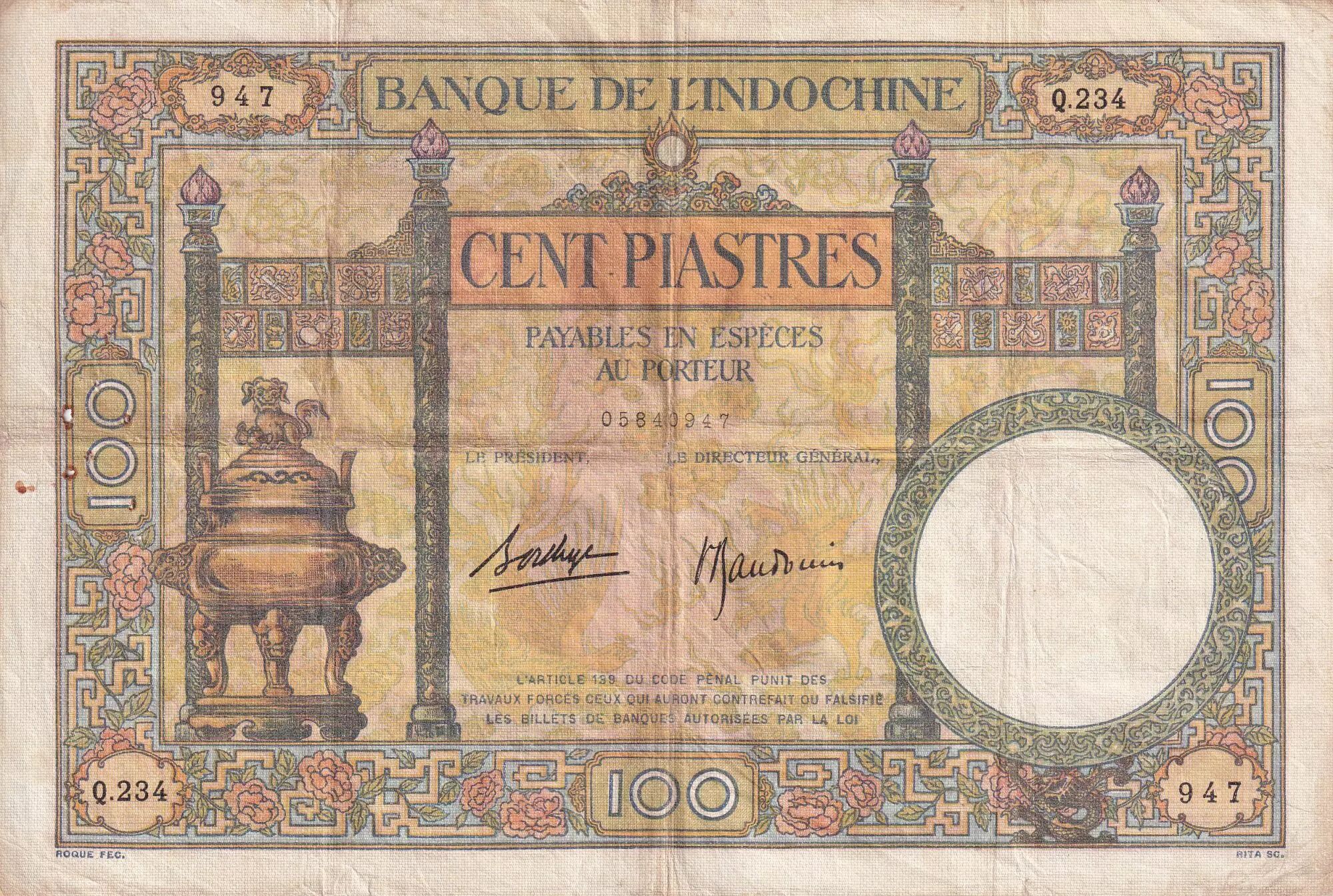 Accueil > Archivage > Indo-Chine Fr. 100 Piastres - Duplex - ND (1936-1939) - Série Q.234 - P.51d