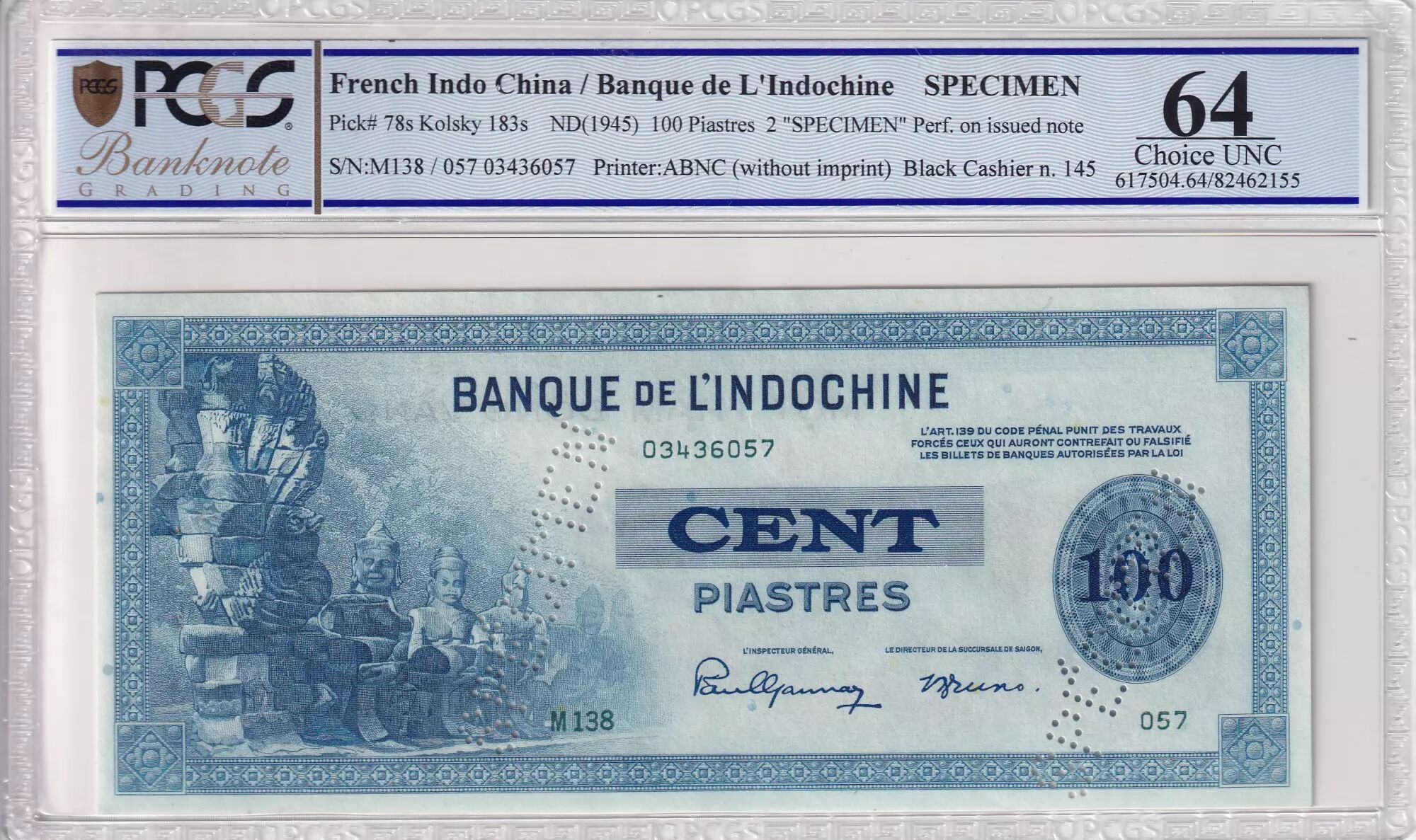 Billet Indo-Chine Fr. 100 Piastres - (ND1945) - Spécimen - PCGS MS 64