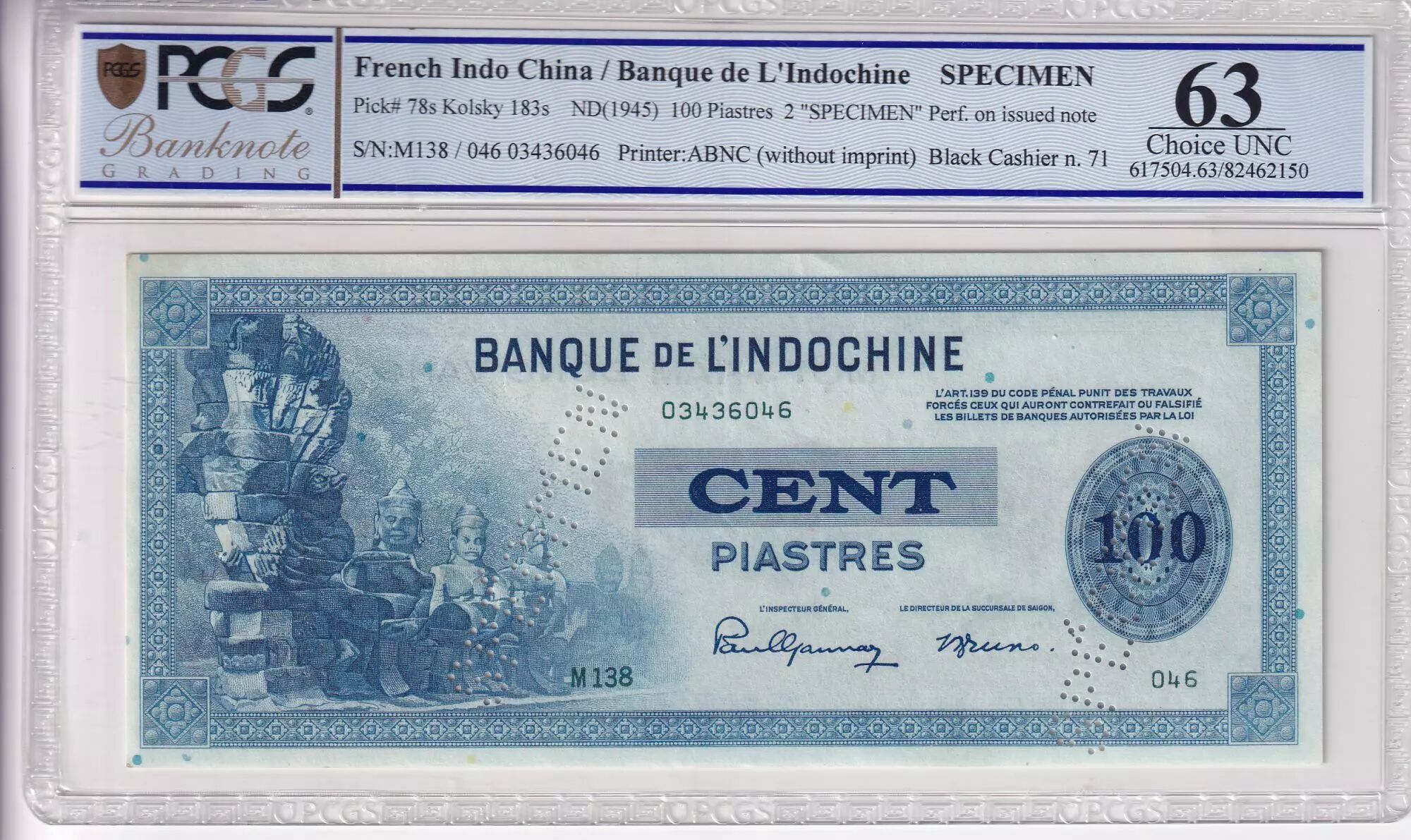 Gradé par PCGS. perforé Spécimen sur billet coursable.