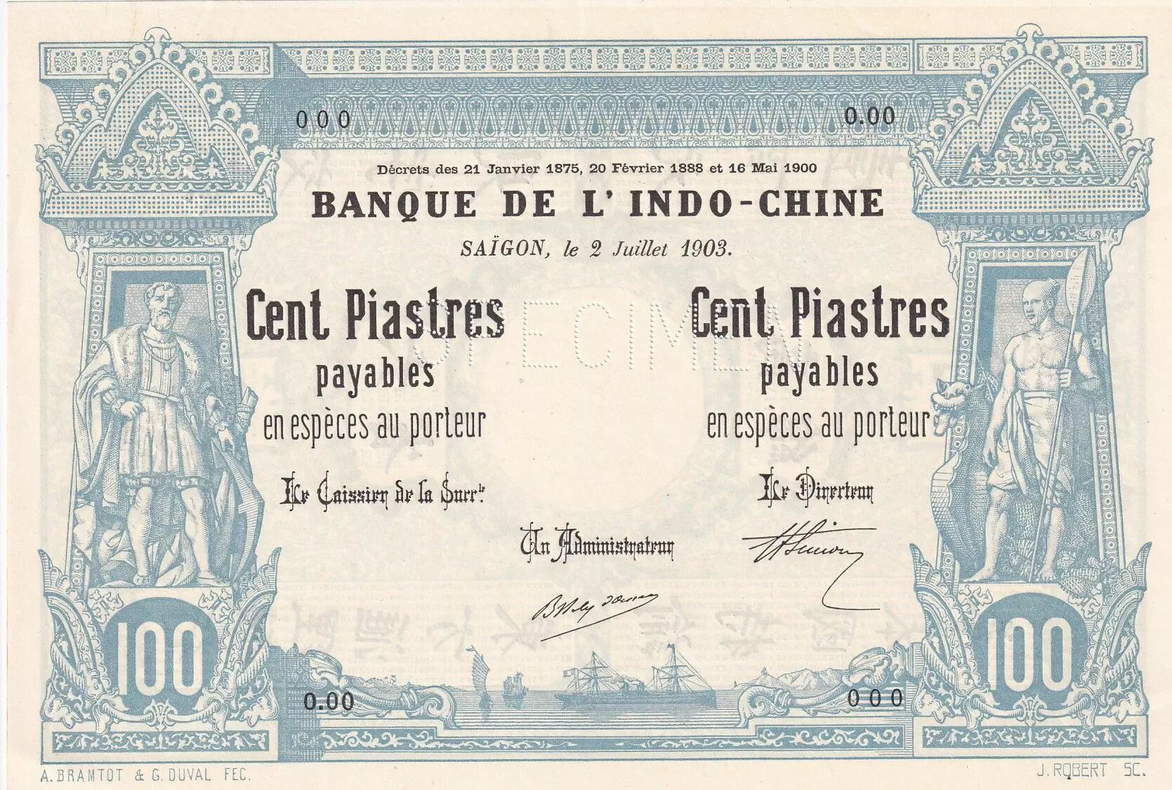 Les inscriptions présentes sur le billet fournissent des informations essentielles. La mention "Banque de l'Indochine" indique l'institution émettrice. La valeur nominale, "Cent Piastres", est répétée à plusieurs reprises. La mention "Payable en espèces au porteur" garantit la convertibilité du billet en monnaie métallique. Les noms de A. Bramtot et G. Duval Fec. ainsi que J. Robert Sc. font référence aux artistes qui ont contribué à la conception et à la gravure du billet.