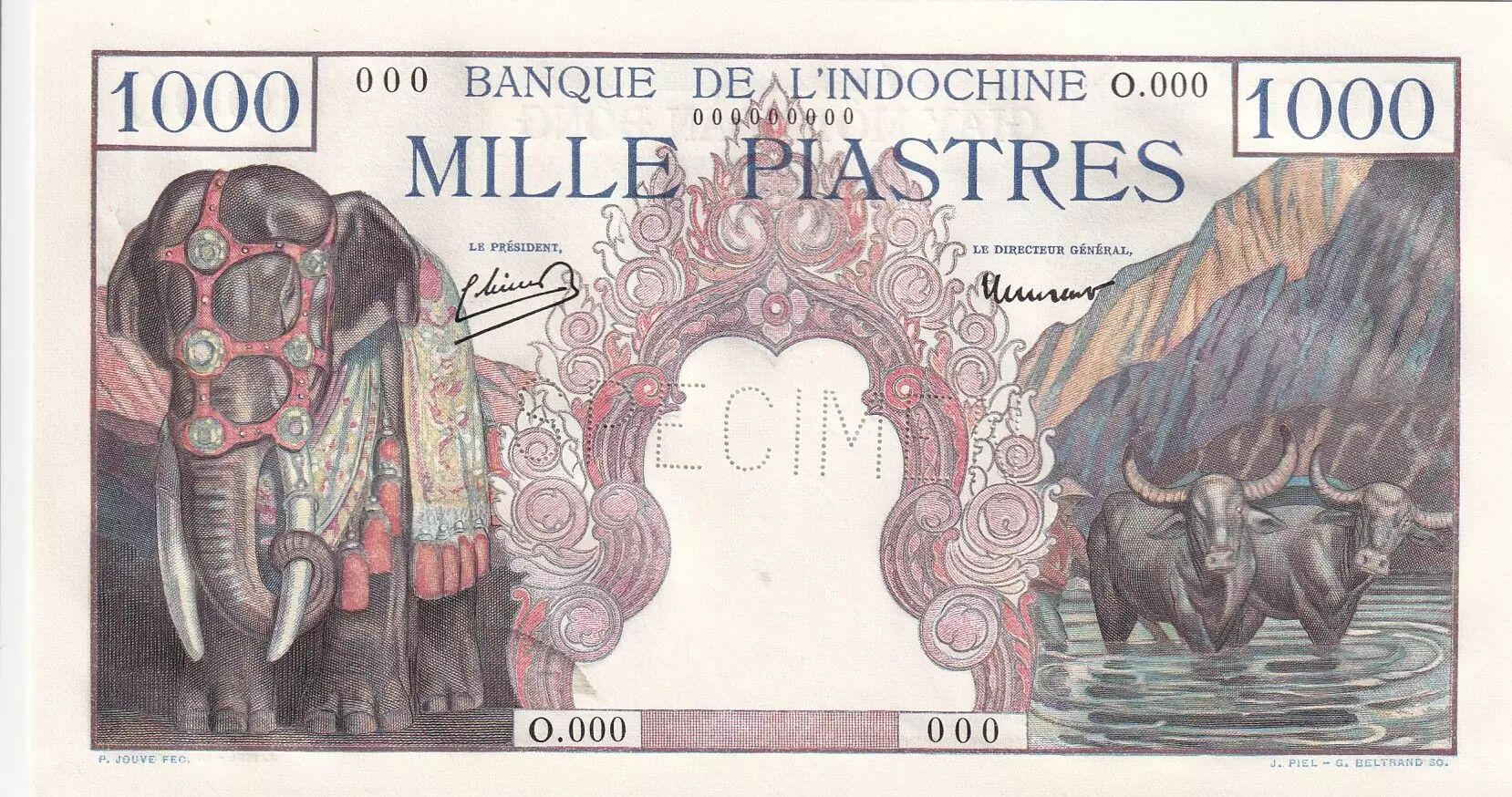 Ce billet de banque de 1000 piastres, datant de 1951, est originaire d'Indochine française. Il représente une valeur nominale de mille piastres. Le recto du billet présente un éléphant positionné à gauche et des buffles d'eau à droite. La mention "BANQUE DE L'INDOCHINE" est clairement visible, accompagnée de l'inscription "MILLE PIASTRES". Les noms des artistes ayant participé à sa création sont également présents : P. JOUVE FEC., J. PIEL et G. BELTRAND SC.