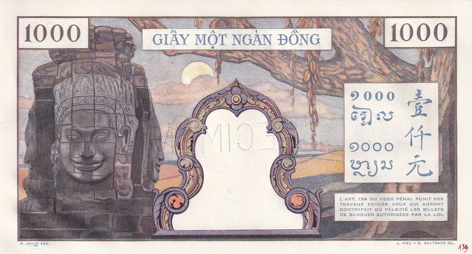 Le verso du billet met en scène quatre visages du bodhisattva Avalokitesvara, situés sur le côté gauche. Une inscription légale est incluse, stipulant que l'article 139 du code pénal punit les contrefacteurs ou falsificateurs de billets de banque autorisés par la loi. Les signatures des graveurs, Jules Piel et Georges Léon Égalité Beltrand, ainsi que le nom du dessinateur, Paul Jouve, figurent également sur cette face.
