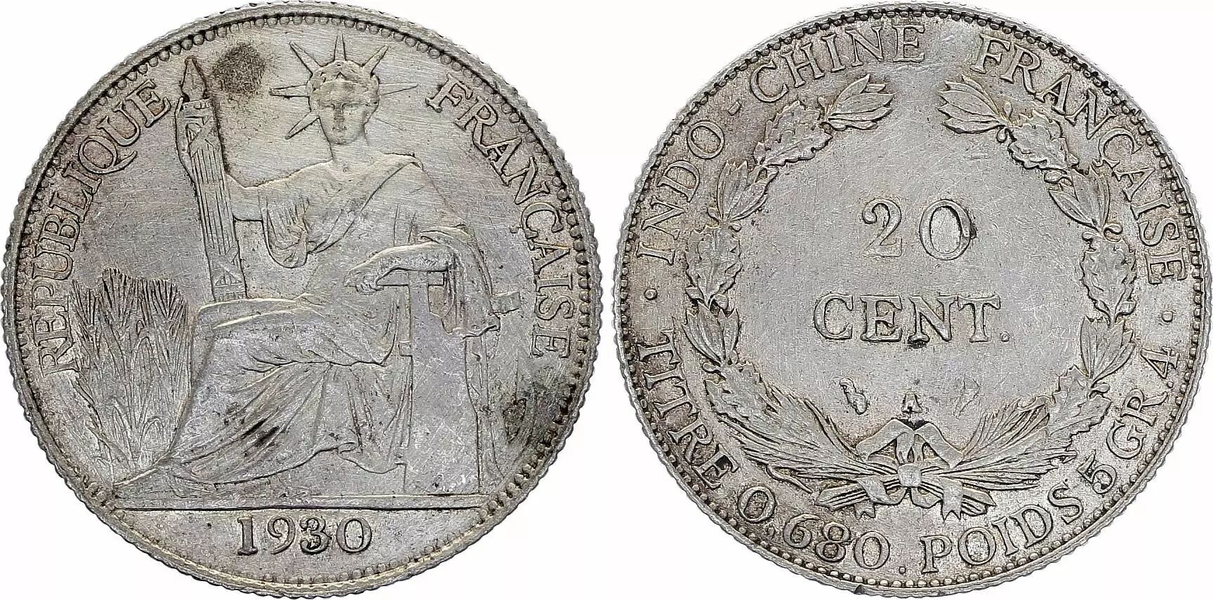 Pièce Indo-Chine Fr. 20 Cents, Liberté assise - 1930