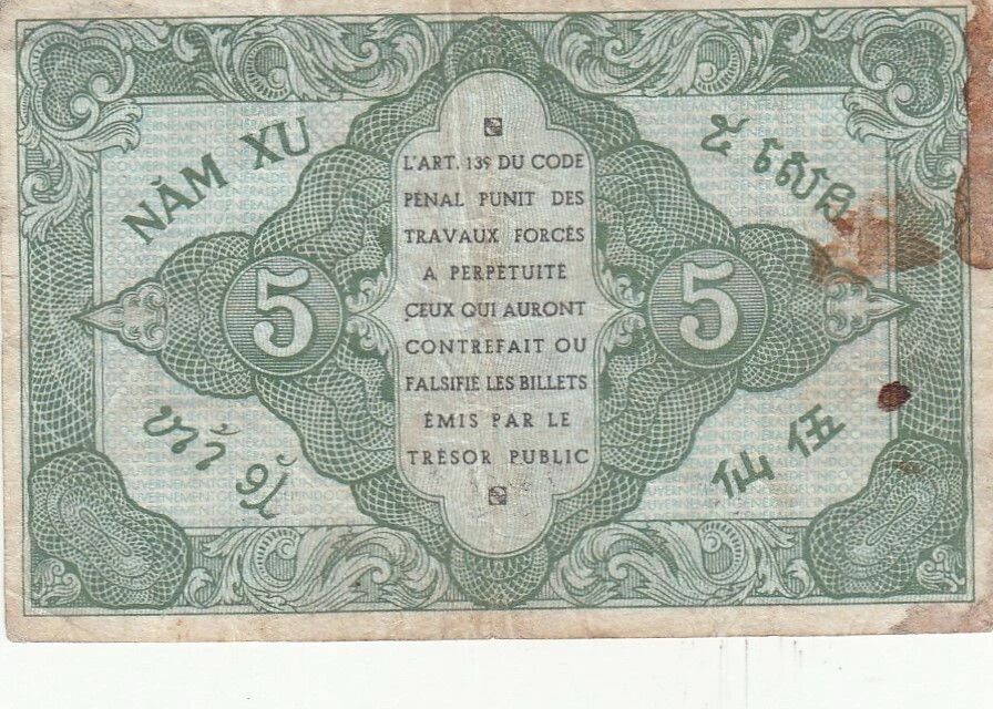Le billet de 5 Cents, émis en 1942, provient de la région de l'Indochine Française. Il représente une valeur nominale de cinq cents, une subdivision monétaire utilisée dans cette région à cette époque.