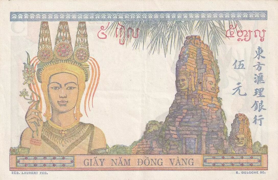 Le billet de 5 Piastres de la Banque de l'Indochine, émis en 1946, présente sur son recto une figure allégorique féminine. Cette figure, aux traits orientaux, arbore un casque et tient une lance, entourée de branches de laurier, symbolisant la République française en Indochine. On peut lire sur le billet la valeur nominale "CINQ PIASTRES" ainsi que les mentions légales relatives aux sanctions pénales pour la contrefaçon de billets de banque. Les signatures du Président et du Directeur Général Adjoint de la Banque de l'Indochine sont également présentes. Le recto est signé par les artistes Sébastien Laurent (dessinateur) et Ernest Deloche (graveur).