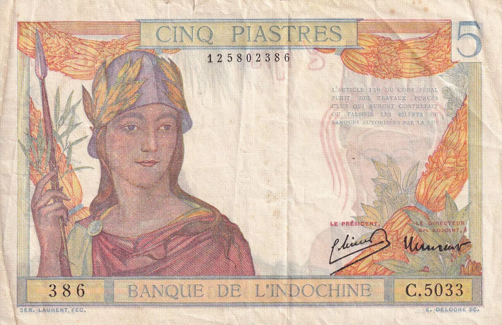 Accueil > Archivage > Indo-Chine Fr. 5 Piastres - Guerrière - 1949 - Série C.5033 - TTB - P.55d