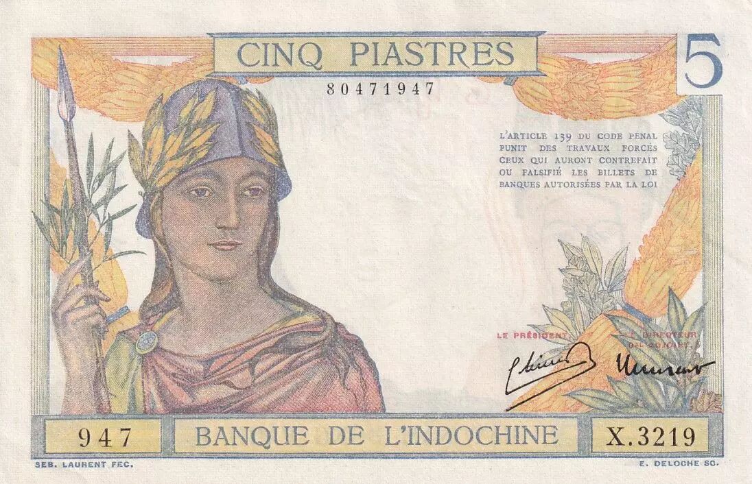 Accueil > Archivage > archivage-Billets du Monde > Indo-Chine Fr. 5 Piastres - Guerrière - ND (1949) - Série X.3219