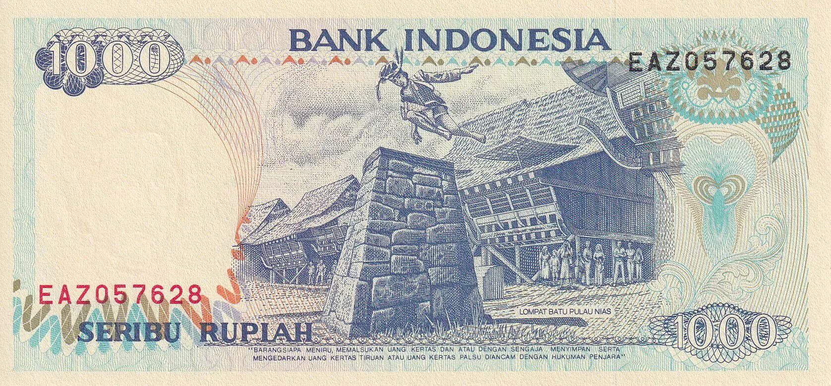 Home > World Banknotes > Asian Banknotes > Indonesia > Indonesia 1000 Rupiah - Lompat Batu Pulau Nias - Danau Toba - 1992 - Serial EAZ - UNC - P.129a