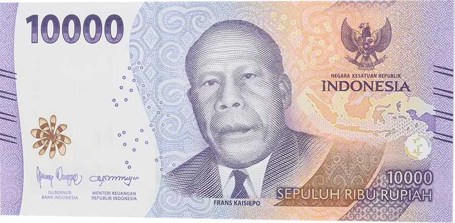 The front of the banknote features a portrait of Frans Kaisiepo. This figure is highlighted on the right side of the banknote. The name of the personality is mentioned under his portrait. Ornamental motifs typical of Indonesia complete the design of the front. The face value, "10000", is printed in numerals in the upper left corner and in words, "SEPULUH RIBU RUPIAH", at the bottom, emphasizing the denomination of the banknote. The mention "NEGARA KESATUAN REPUBLIK INDONESIA" also appears, identifying the issuing country, as well as the signatures of the officials of the Bank of Indonesia.