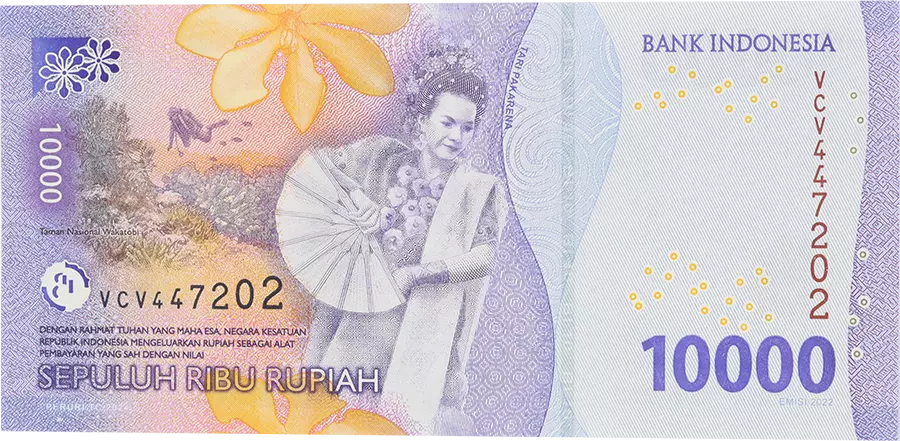 This banknote is issued by Indonesia and has a face value of 10,000 rupiahs. The issuance of this banknote dates back to 2024 and it belongs to the VCV series.