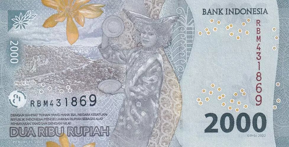 The reverse of the banknote features the bank's logo, as well as a landscape of Ngarai Sianok (Sianok Canyon), located near Bukittinggi, in western Sumatra. There is also a representation of the champak flower (Magnolia champaca), as well as a Tari Piring dancer (dancer with plates). The inscriptions include the face value "2000", the mention "BANK INDONESIA", the name "NGARAI SIANOK", the phrase "DENGAN RAHMAT TUHAN YANG MAHA ESA, NEGARA KESATUAN REPUBLIK INDONESIA MENGELLIARKAN RUPIAH SEBAGAN ALAT PEMBAYARAN YANG SAH DENGAN NILAI DUA RIBU RUPIAH" (By the grace of Almighty God, the United States of the Republic of Indonesia has issued the rupiah as a legal payment instrument with a value of two thousand rupiah), the mention "EMISI 2022" (emission 2022) and "PERURI TC 2022".