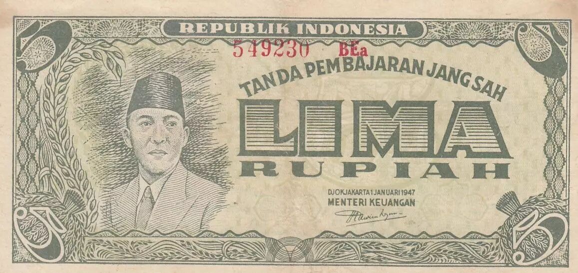 Banknote Indonesia 5 Rupiah - Dr Soekarno - 3 letters - 1947