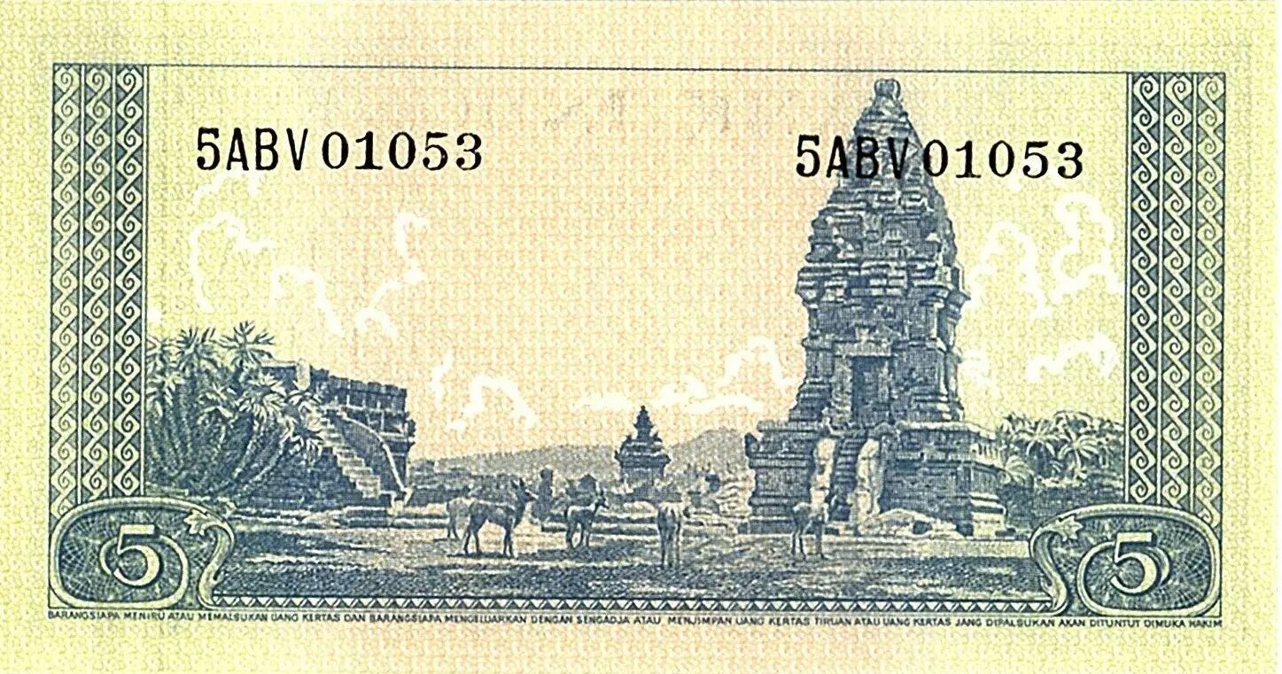 Banknote Indonesia 5 Rupiah, Oran-Utan - Prambanan temple - 1957 - P.49