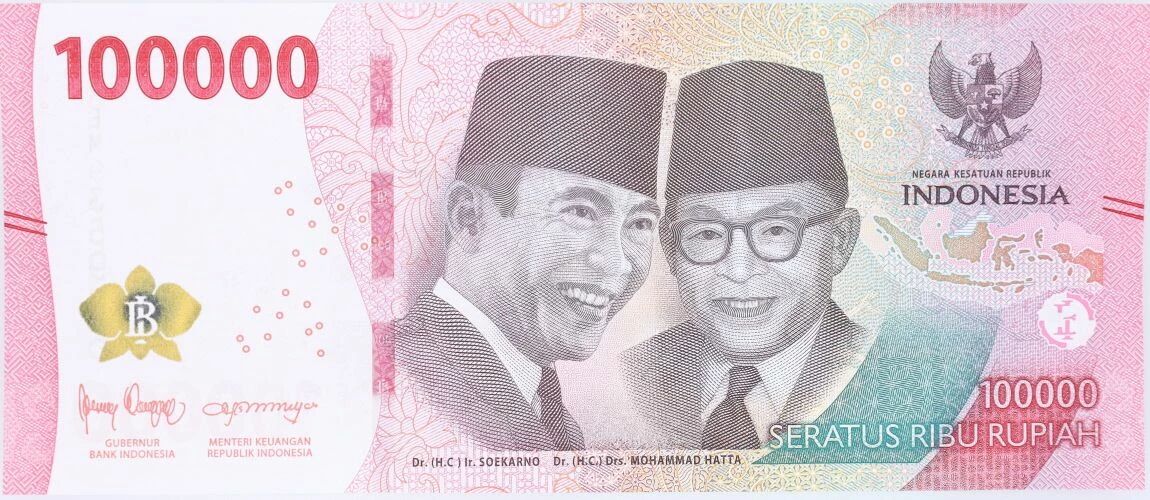 Le recto du billet présente plusieurs éléments graphiques et symboliques. On y trouve une représentation de la fleur d'orchidée papillon, aux côtés des portraits de Soekarno et Mohammad Hatta. Une carte de l'Indonésie est également visible, ainsi que le blason national. Le logo de la banque émettrice est intégré comme dispositif de vérification d'authenticité.