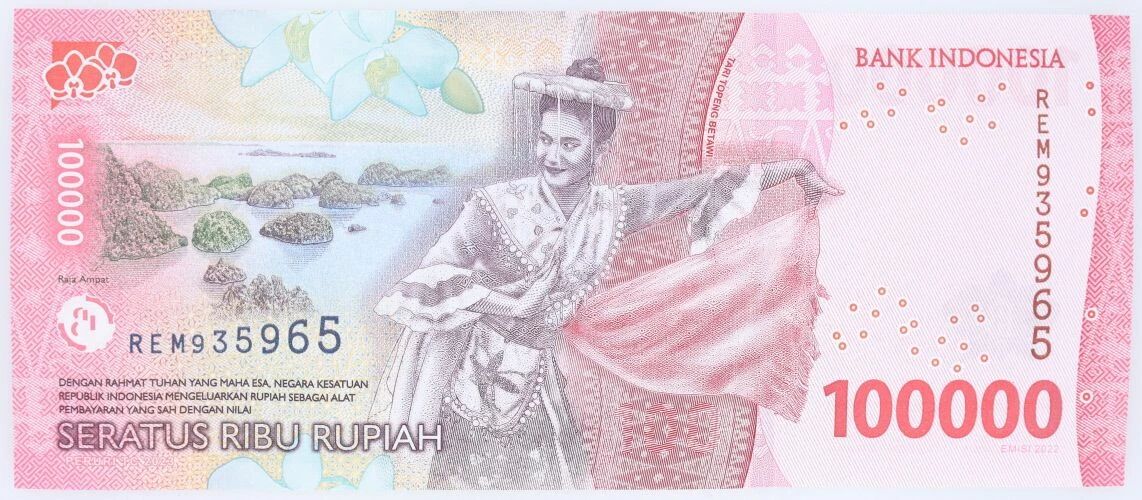 Ce billet de banque est émis par l'Indonésie, avec une valeur faciale de 100 000 rupiahs. Il date de l'année 2023 et appartient à la série REM.