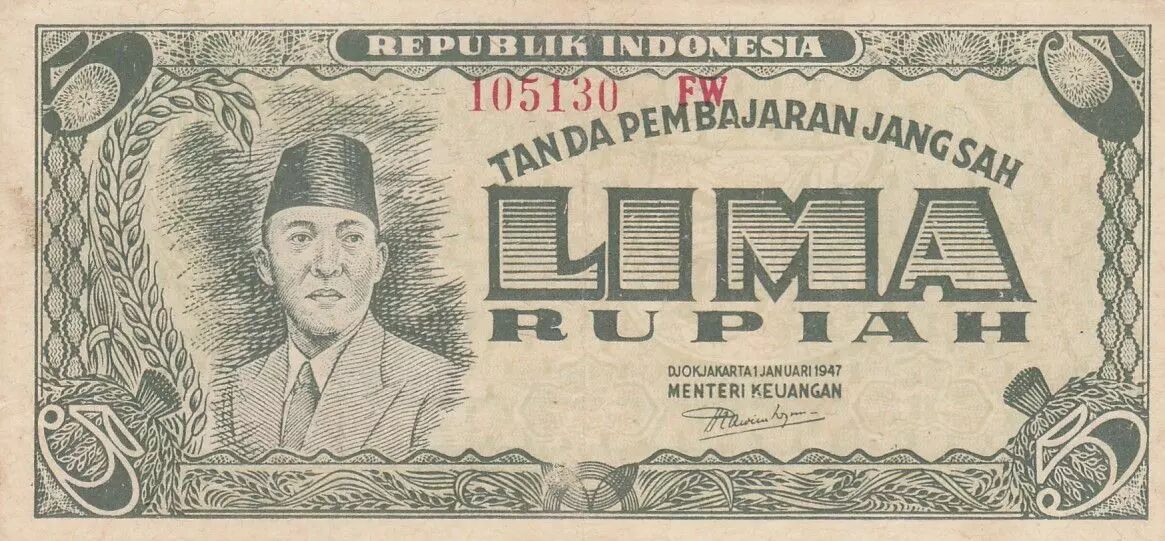 Billet Indonésie 5 Rupiah - Dr Soekarno - 2 lettres - 1947