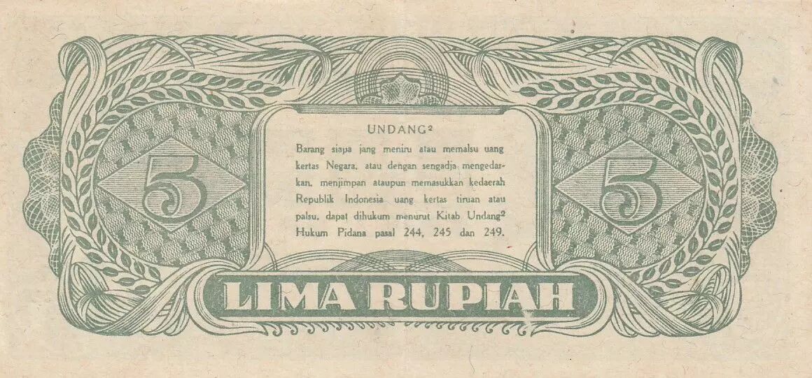 Accueil > Archivage > archivage-Billets du Monde > Indonésie 5 Rupiah - Dr Soekarno - 2 lettres - 1947