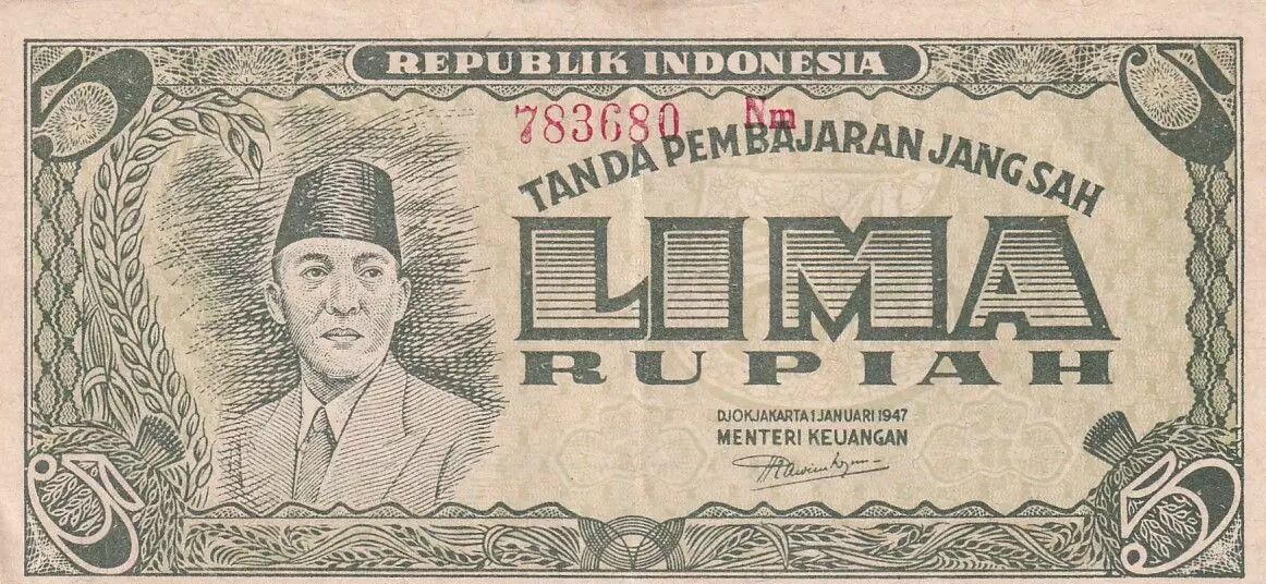 Billet Indonésie 5 Rupiah - Dr Soekarno - 2 lettres - 1947