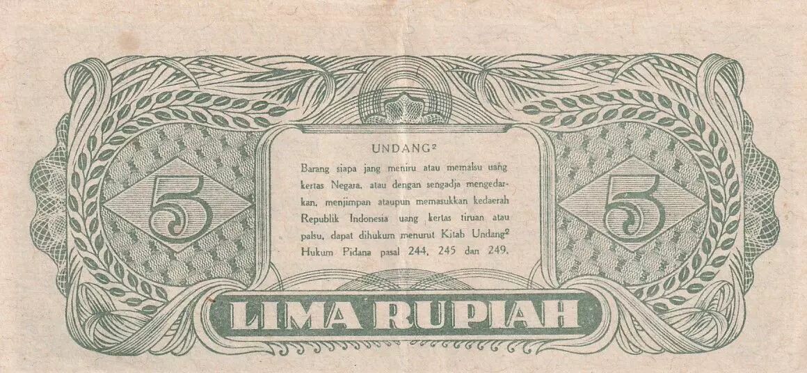 Accueil > Archivage > archivage-Billets du Monde > Indonésie 5 Rupiah - Dr Soekarno - 2 lettres - 1947