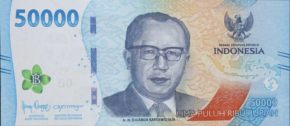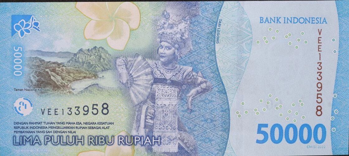 Ce billet de banque de 50 000 rupiah, émis par l'Indonésie en 2024, appartient à la série VEE. Le recto du billet présente plusieurs éléments distinctifs. On y trouve un portrait de Ir. H. Djuanda Kartawidjaja, homme politique indonésien. Une fleur de Jepun, également connue sous le nom de frangipanier, est aussi représentée. Une carte de l'Indonésie est incluse, ainsi que le blason national et le logo de la banque émettrice, servant de dispositif de vérification.