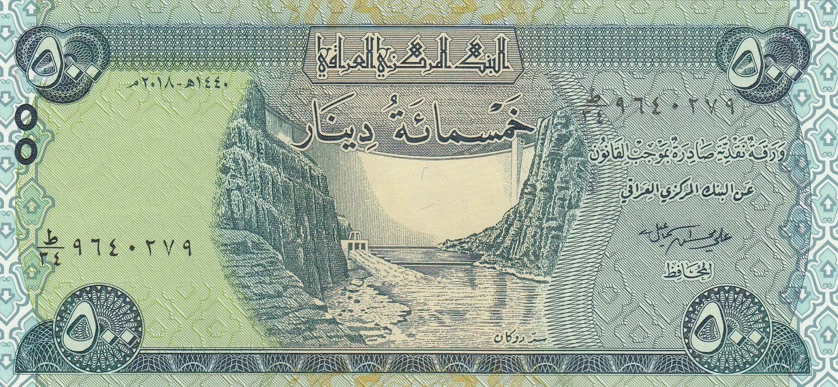 Au recto, le motif principal est un barrage hydroélectrique, symbole de l'ingénierie et du développement en Irak. Le billet arbore également une représentation de la statue ailée, une figure emblématique de l'histoire et de la culture irakiennes. La valeur nominale de 500 dinars est clairement indiquée en chiffres arabes et en lettres arabes. Des éléments décoratifs géométriques et floraux ornent également cette face, ajoutant une dimension esthétique au design. On y trouve aussi les signatures officielles des autorités monétaires compétentes.