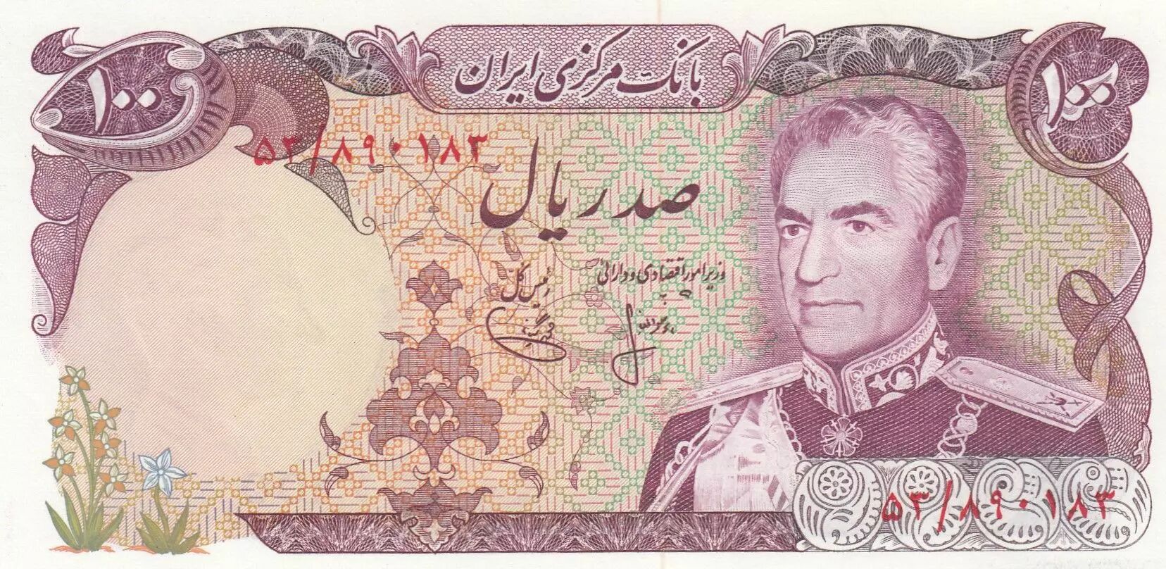 Ce billet de banque, d'une valeur nominale de 100 rials, a été émis en Iran en 1974. Il s'agit d'un billet de la série courante, arborant des motifs de couleur marron dominant sur un fond complexe mêlant orange, vert et diverses autres teintes.
