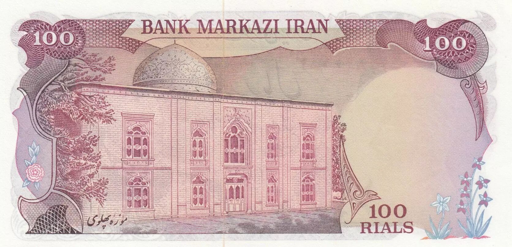 Au verso, le billet représente le Musée Pahlavi, situé sur la gauche du centre. Le filigrane du billet reproduit le portrait du jeune Shah Pahlavi, visible lorsqu'il est exposé à la lumière.