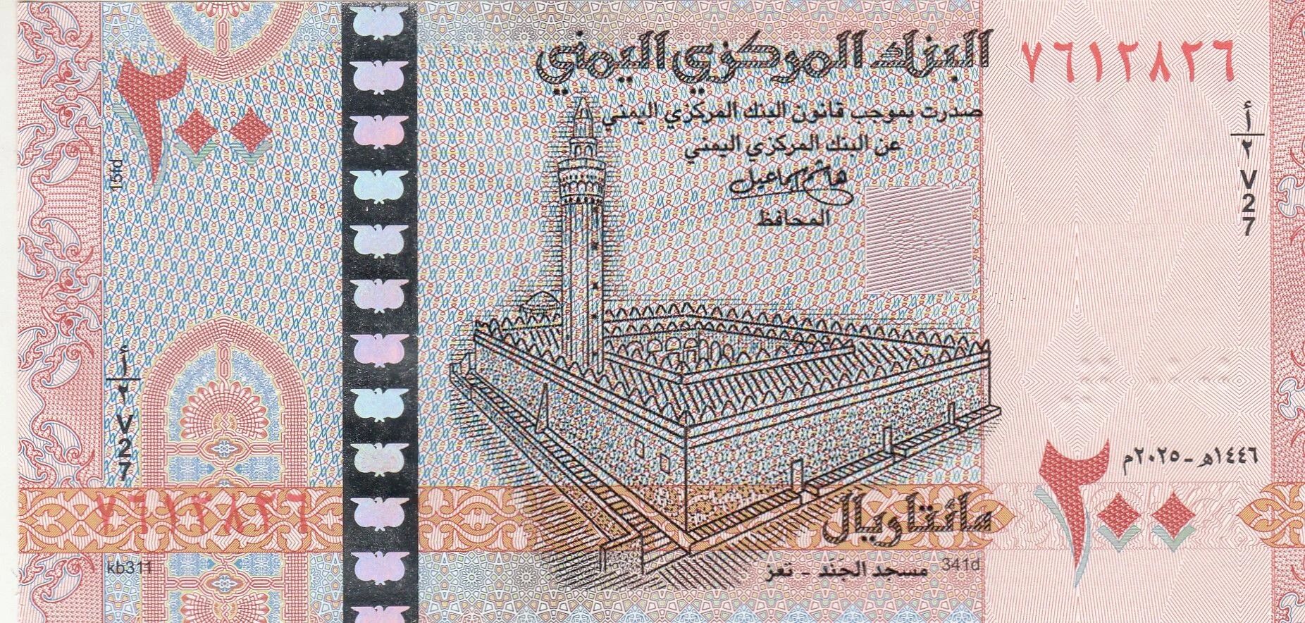 The front of the banknote features an illustration of the Al Janad Mosque, located in Ta'izz. This mosque is an important place of worship and a cultural symbol of the region. The image of the mosque is the main motif on this side of the banknote. The amount "200" is visible in the upper right corner.