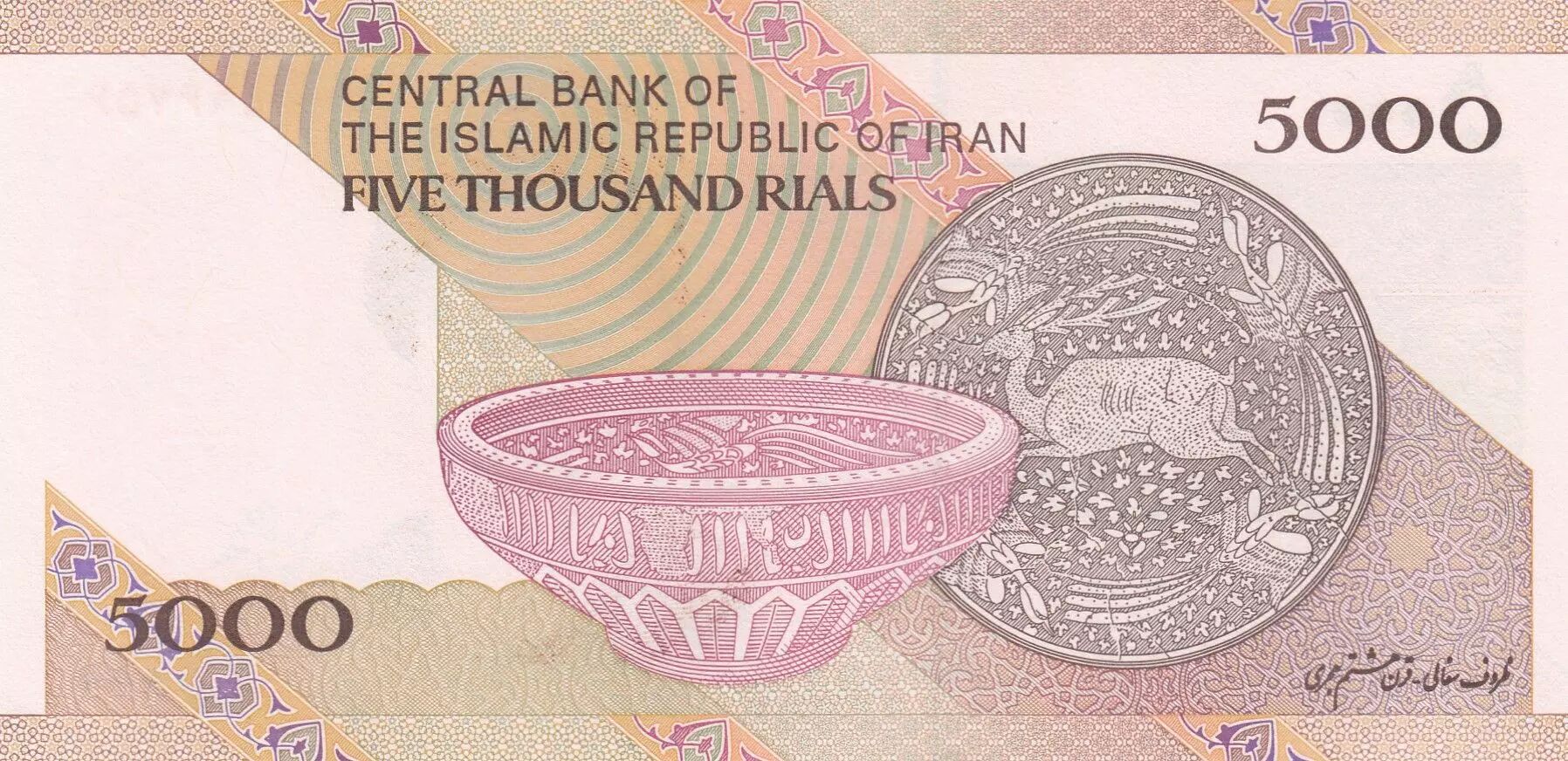On the back, the banknote depicts pottery from Zabol. The inscriptions are in both Latin and Perso-Arabic. You can find the name of the central bank in English ("CENTRAL BANK OF THE ISLAMIC REPUBLIC OF IRAN"), as well as the face value in numbers and letters ("5000", "FIVE THOUSAND RIALS"). An inscription in Perso-Arabic refers to "ceramic vases - eighth century of the Hijra".