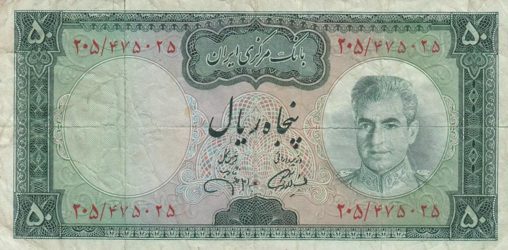 Ce billet de banque fait partie d'une série émise par l'Iran, avec une valeur nominale de 50 rials. Il reflète une période spécifique de l'histoire iranienne, marquée par le règne de Mohammad Reza Shah Pahlavi. Les couleurs et les motifs employés dans la conception du billet sont typiques des billets de banque de cette époque.