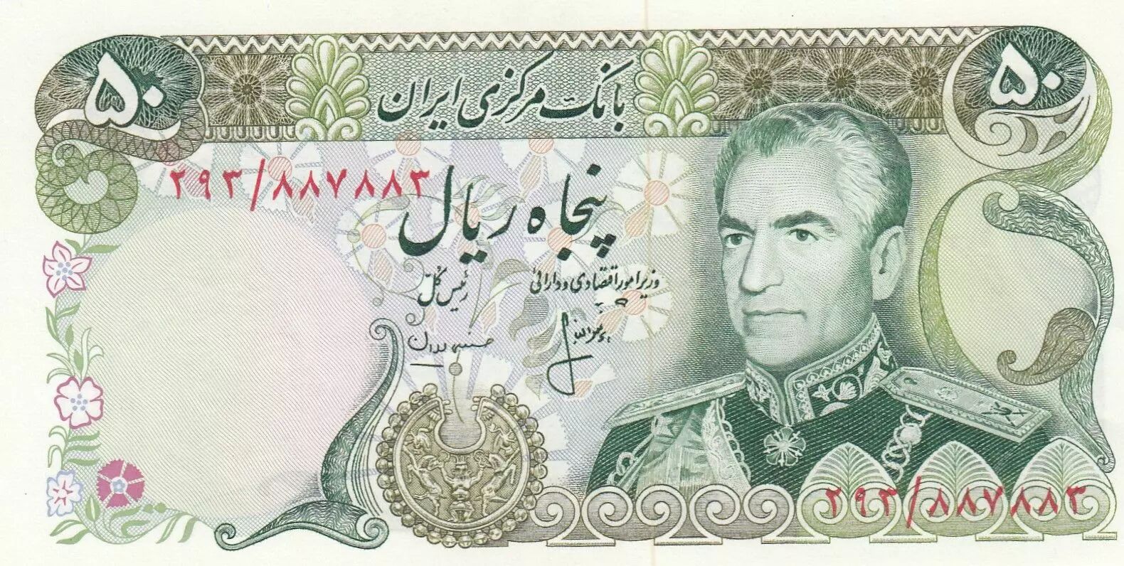 Ce billet de banque est une coupure de 50 rials émise en Iran entre 1974 et 1979. Il s'agit d'une émission datant du règne du Shah Pahlavi.